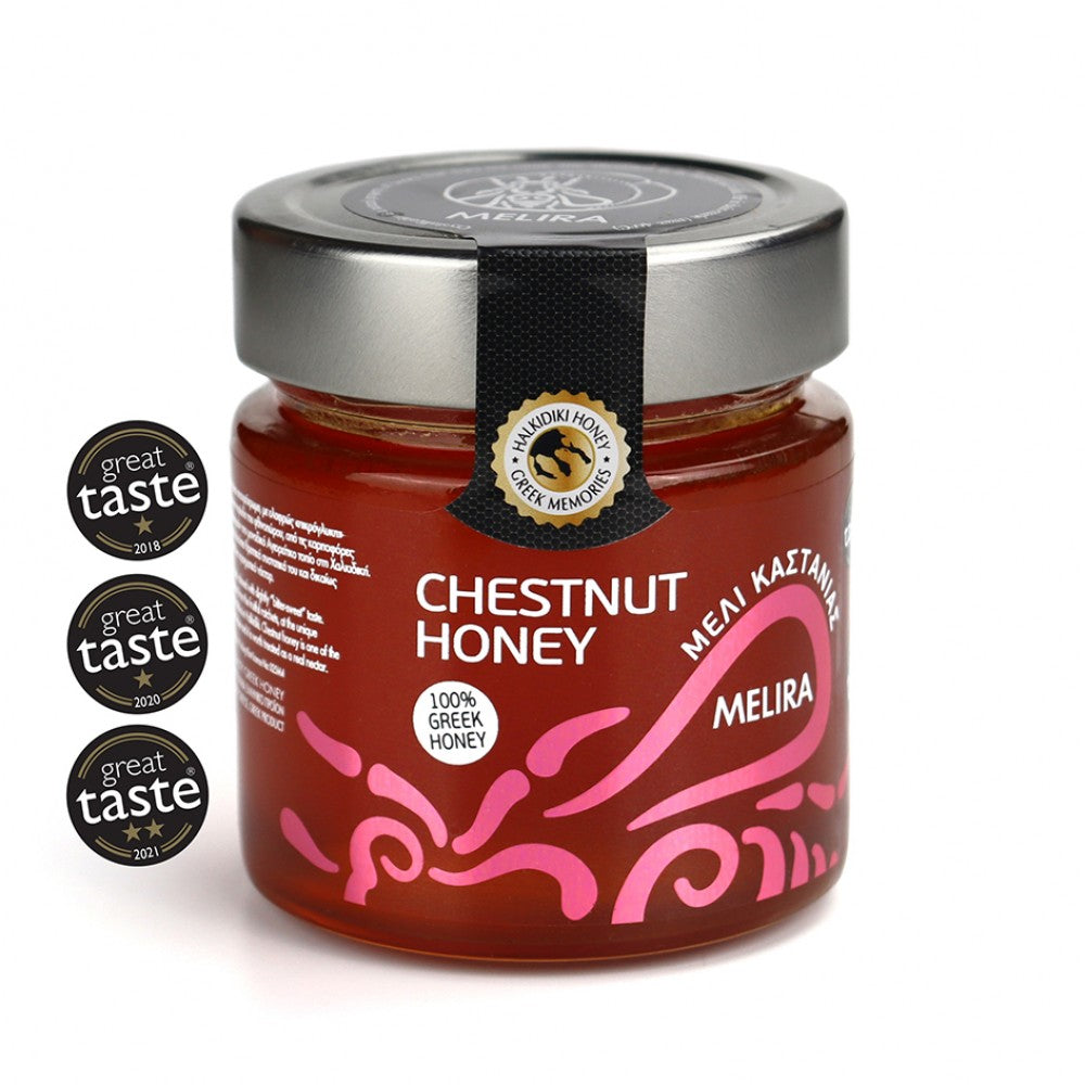 Chestnut honey is dark colored with slightly “bitter-sweet” taste. It is collected in autumn from the fruitful ratchets, at the unique landscape of Mount Athos in Halkidiki. Chestnut honey is one of the richest in nutritional value and it is worth treated as a real nectar.